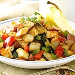 红肉小马铃薯340克,橄榄油2汤匙,中等大小的洋葱1个,剁碎,小青甜椒1个,去籽后切条(1.5厘米宽),小红甜椒1个,去籽后切条(1.5厘米宽),熟鸡肉170克,切块(1.5厘米见方),大蒜1大瓣,切末,甜辣椒粉(paprika)1茶匙,干百里香1/2茶匙,压碎,盐1/2茶匙,黑胡椒粉1/2茶匙