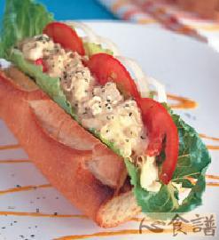 3.取作法1的法国面包,于中间夹入作法2的鸡肉沙拉,再配上莴苣叶和蕃茄片即可。