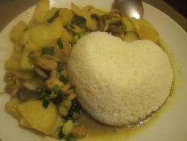 6、将炒好的咖喱鸡肉连同汤汁一起浇在米饭上食用即可。