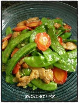 3.然后一起放入荷兰豆和胡萝卜,炒熟勾芡出锅~