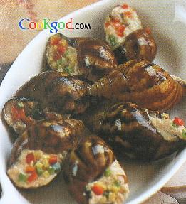 2、花螺壳洗净,把拌好的馅酿入花螺壳内,入蒸锅蒸4分钟即可。