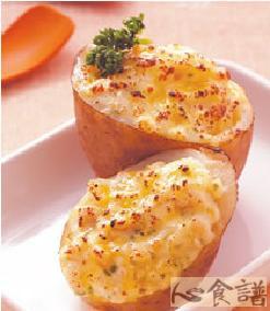 1.马铃薯对切后,连皮一起放入烤箱中以150℃烤约分钟至熟后,将大部分的马铃薯泥挖出(像有一个凹糟的马铃薯皮保留)。
