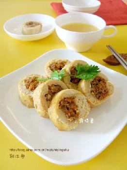 2.将肉馅放在容器内,加入适量盐,胡椒粉,料酒调味,最好再加上一些颜色较重的酱油,这样做好的肉卷颜色分明,放好调料后将肉馅搅打上劲,这时准备一些自己喜欢的蔬菜丁,如胡萝卜、荸荠、香菇等,把他们剁碎放入肉馅中,搅匀后放在铺平的鸡肉片上,小心的将它卷起成筒状。