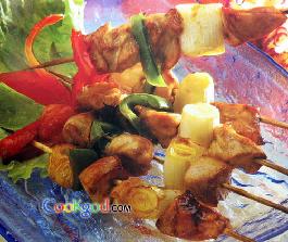3、按照鸡肉、葱、青椒、红椒的顺序,以竹签依次串入,把腌酱汁均匀地刷在上面,放入烤盘移入烤箱,以250℃烤15分钟取出盛盘即可。