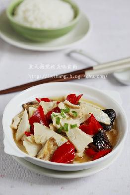 4.炒锅内注入底油,下葱姜末爆香,倒入鸡肉、冬笋片、香菇片、红椒片后加少许盐、味精、胡椒粉、料酒和水淀粉,翻炒均匀即可出锅。