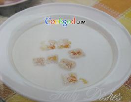 3、冲入另一半牛奶和奶油。搅拌均匀后放清水再搅匀,煮沸后过滤,汤用盐调味即可。