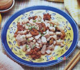 3、烧热铁锅,倒入猪油,投入鸡丁滑透,捞出。再起铁锅,倒入热油,下入葱、姜、蒜稍煸炒,将鸡丁下锅,把对好的汁倒入锅内,再放入核桃仁炒匀,收汁即成。