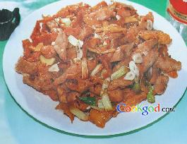4、切好的条下入六成热油中炸黄捞出。炒锅内留油20克,下入葱、姜、蒜炝香,倒入鸡肉条,烹入用余下调料对成的汁,翻匀装盘即成。