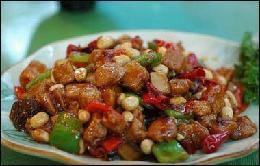 四川成都名菜,成菜色泽金黄,鸡肉鲜嫩,花生米香脆,咸辣略带酸甜.此菜创于清代