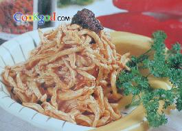 1.将鸡脯肉切成丝,用开水焯熟,捞出投凉。