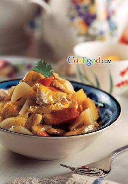 色泽淡黄,咖喱味浓。也可以先把咖喱粉放入锅内,再放入胡萝卜、土豆、鸡块慢慢炖。