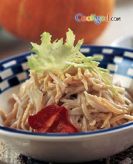 3.往锅里放油加热,放入鸡丝、金针菇及少许水炒熟,最后加盐调匀,盛起时撒上葱丝和红辣椒,淋上少许香油即可。