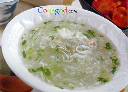3、锅内水烧沸后加盐、味精,入鸡末、火腿丝烧沸煮出清香味,淋上香油,加莼菜即成。