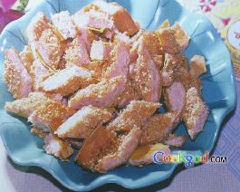 4、炸好的鸡坯切成象眼块,装盘即成。