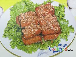 3、再抹上鸡蛋清,两面沾匀芝麻仁。下入五成热油中炸至浮起捞出装盘即成。食用时配椒盐,甜面酱即成。