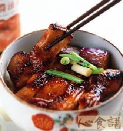 4.先将鸡腿肉取出,切成适当大小放白饭上,再摆上茄子、青葱、香菇,最后淋上锅中剩余的酱汁即可。