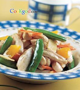 5.锅中留底油烧热,爆香姜片,放入甜豆荚、胡萝卜、盐、味精用大火炒熟,加入鸡肉炒匀即可。