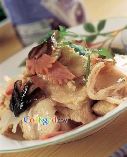 3.锅内加油,烧至七成热,倒入冬笋、冬菇煸炒,加高汤、精盐、料酒、味精、火腿片烧开,撇去浮沫,放入鸡片,烧开后用水淀粉勾芡,淋上香油即成。