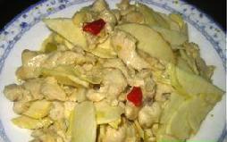 4.原锅留少许余油置旺火上,下姜丝、葱段和笋片炒香,倒入绍酒,溅些滚水,加白糖、鸡精粉、盐,随放入鸡片翻匀,淋上些熟油和匀,装碟即成。