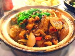 3、锅上火,炒香青椒、红椒、葱、豆豉,放入鸡块,调入生抽、盐、味精炒匀,转入沙锅中用微火焖至入味,撒上葱段即可;