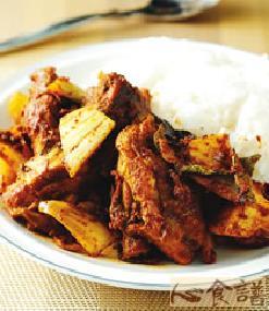 3.在作法2中加入作法1的马铃薯块、水、椰浆粉、盐和细砂糖调味,以小火煮至汤汁略收干,最后加入作法1的洋葱片拌匀,续煮至软起锅,食用时佐以香米白饭即可。