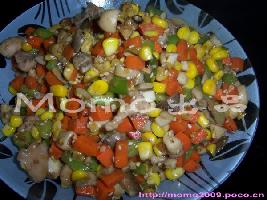 3.玉米洗净后用刀将玉米粒沿芯切下。青椒洗净后去囊切粒。红萝卜去皮洗净后切粒。草菇去根去蒂洗净后切粒焯水。
