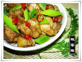 2.炒锅入油八成热时将蒜末、大葱末放入煸香,接着将切成小段的小红朝天椒放入略煸后将腌制好的鸡腿块放入,转大火快炒3分钟后将切成菱形块翻炒3分钟后加入鸡精兜匀后即可起锅装盘了!