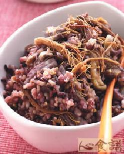 五谷米2杯,去骨鸡腿肉400公克,人蔘鬚10公克,水3杯,沙拉油2大匙,盐1小匙