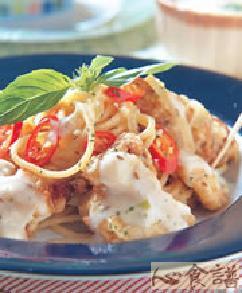 鸡腿排1只,白酒适量,盐适量,辣椒粉1茶匙,低筋面粉2大匙,玉米粉2大匙,水适量,鸡蛋2颗,沙拉油适量,奶油40g,洋葱丝40g,煮熟义大利面180g,茴香酱6大匙,辣椒片8g,红萝卜碎5g
