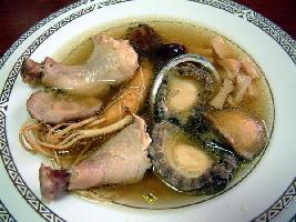 这道汤的特色是一股清淡的竹香里融合了鲜人叁的药味,冬菇的香气,干贝和鸡腿的浓郁鲜美,还有鲜鲍鱼的独特口感,充满了秋的气息。