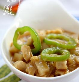 主料:鸡腿肉,藕,青椒,配料:蒜蓉辣酱,葱,姜,蒜,糖,淀粉,料酒,鸡精,香油