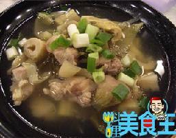3.另滚一锅水,放入鸡腿块、酸菜和笋干煮30分钟后,再加入干贝粉、盐和葱段拌煮均匀即可完成