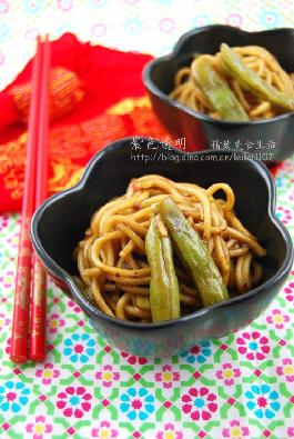 豆角半斤,切面3两,,母亲辣子鸡丁酱,,盐,,生抽,,油,,葱。