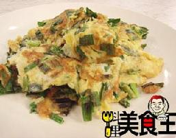 3.锅中烧热2大匙油,倒入韭菜蛋汁煎至熟透,再起锅盛入盘中即可完成
