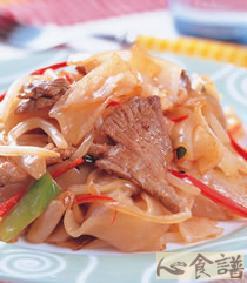 4.另取锅,加入1大匙沙拉油烧热后,放入作法1的河粉大火快速翻炒约10秒后,再加入作法1的洋葱丝、辣椒丝、蒜末及调味料B续炒均匀后,加入作法3的牛肉片、作法1的韭菜和银芽炒至入味即可。