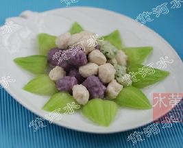 4.3、锅内加清水,烧至微沸,分别将三种颜色的鸡肉茸汆成丸子