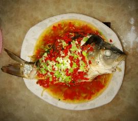 2、鱼盘内放入切好的生姜絲,将鱼放在盘里,鱼身上码上切好的剁椒,蒸锅把水烧开后将摆好的的鱼上锅大火蒸10分钟即可取出;