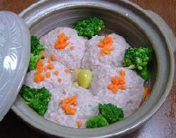 1.猪肉和葱,姜各2.5克,切成高粱米大小的碎末,加酱油,料酒,盐及水淀粉拌匀,团成四个扁圆形的肉丸子。