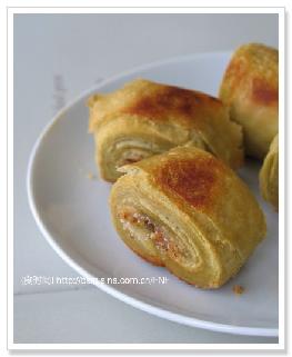 8.做的时候,把面团擀皮到半厘米厚的放长形,中央放上核桃馅,卷起来成筒状,用刀切成几等分。