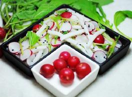 年糕100g,水萝卜100g,调料:白醋4g,白葡萄酒4g,香油4g,盐3g,糖5g,鸡精2g,黑芝麻2g