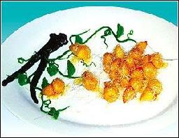主料:山楂糕350克。芝麻仁10克,鸡蛋25克。冰淀粉15克,面粉30克,花生油500克(实耗油75克),白糖75克,桂花酱5克。