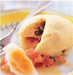 玉米籽60公克,水40㏄,牛奶80㏄,蕃茄30公克,葡萄干30公克,白兰地5㏄,醋少许,蛋1颗,胡椒粉适量,盐适量