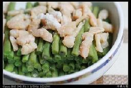 主料:干虾仁2两,鲜豇豆1斤,精盐,味精,小磨香油适量。