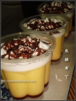 焦糖的制作:砂糖和水(2茶匙)入小锅,小火熬成琥珀色后,加水50ml,这时糖会结块,保持小火熬化结块的糖即成焦糖,倒出晾凉备用。