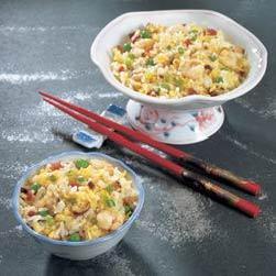 扬州炒饭香味馥郁,制法简易,秘诀在于米饭与蛋液要拌匀,最宜一至二人食用。此道炒饭富含维生素A、B族,以及钙、磷。