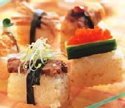 1.将四方形模型或便当盒舖上保鲜膜,再将白饭置于保鲜膜上,均匀填满模型或便当盒,并紧密压实,然后取出。