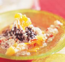 黑糯米50公克,薏仁30公克,酒酿20公克,芒果丁10公克,香蕉丁10公克,柳橙丁10公克,辣椒酱5公克,米酒10㏄,盐少许,绵白细糖少许