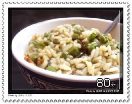 1.切碎了几根豆角,一只番茄,再加一匙橄榄菜,加一点儿高汤或者清水,米饭(昨晚剩下的),放到不粘小锅里,用大火烧开,小火再焖一会儿。