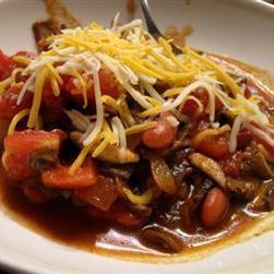 初榨橄榄油2汤匙,中洋葱2个,切成小块,大蒜2瓣,切碎,普通辣椒粉1汤匙,特辣干辣椒粉1/4茶匙,褐色大蘑菇670克,切成1.3厘米厚的片,意大利式蕃茄罐头1罐(780克),红芸豆罐头1罐(540克),盐适量,黑胡椒1/2茶匙