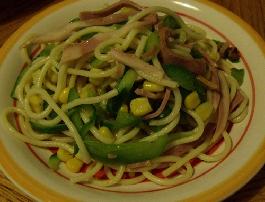 通心粉2两,咸肉少许,青椒、玉米粒、黄瓜丝各适量。